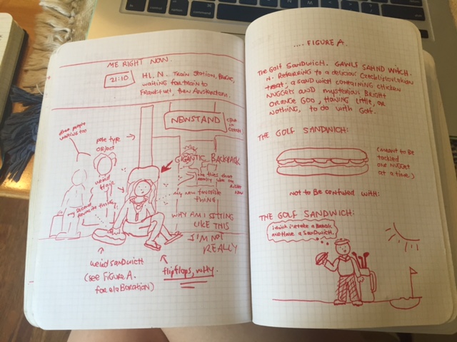 Verb: to be a young person traveling through Europe alone with a journal; to frantically journal in it. Whenever anyone asks you what your deal is, you lie and say you’ve been hired to write …