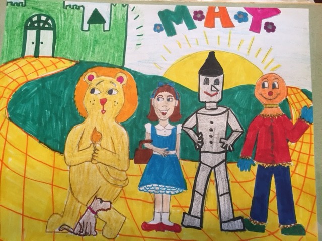 I PRESENT: the months of May from my childhood (pre-teen? Oh dear) calendar drawings, featuring picnics, bday parties, The Wizard of Oz (?) and a distinct lack of elbows or wrists!