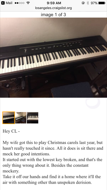 I finally agreed to let Morrison sell the keyboard that has been just sitting there untouched for a year, after my failure to re-learn it last fall. I mean, it’s one thing to admit failure, …